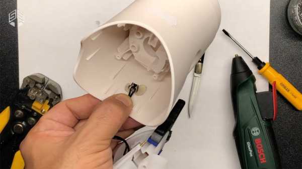 Пока клей не остыл, держим одной рукой провод, другой рукой прижимаем кнопку к стенке корпуса освежителя отверткой или чем нибудь другим, чтобы кнопка не сползла, пока термоклей не застынет. Примерно через 2-3 минуты можно аккуратно убрать отвертку и отпустить провод.