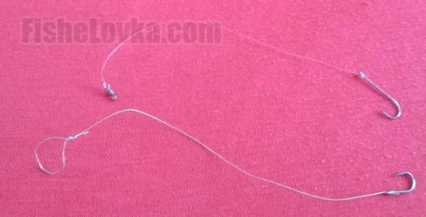- Оба поводка с крючками привязываются в одной точке. Могут использоваться отводы одинаковой или разной длины. Этот вариант самый простой, но леска будет путаться и перекручиваться. Придется регулярно менять ее на новую.