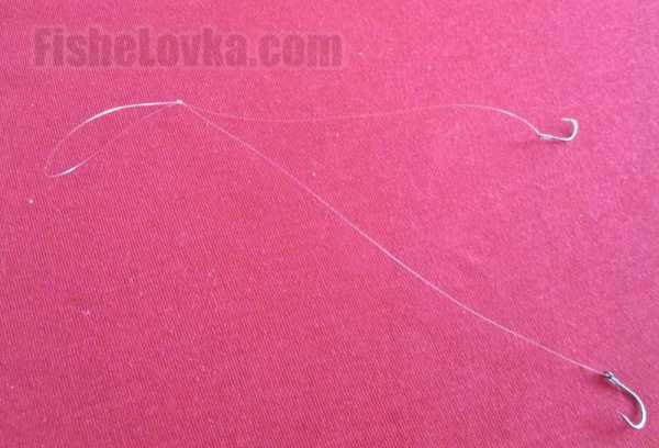 В принципе, этот процесс похож на процесс вязания поводков с одним крючком. Вначале делаем всё то же самое — отматываем немного лески и к её концу привязываем первый крючок. Вяжем точно таким же узлом, как и предыдущий поводок.