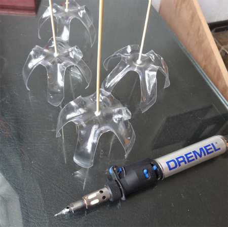 Паяльником делаете отверстия и насаживаете на деревянные палочки. Пластик застывает быстро, поэтому для надежности можно добавить суперклея.