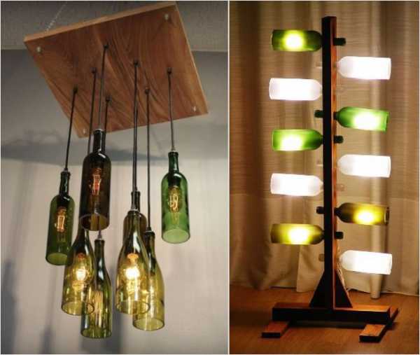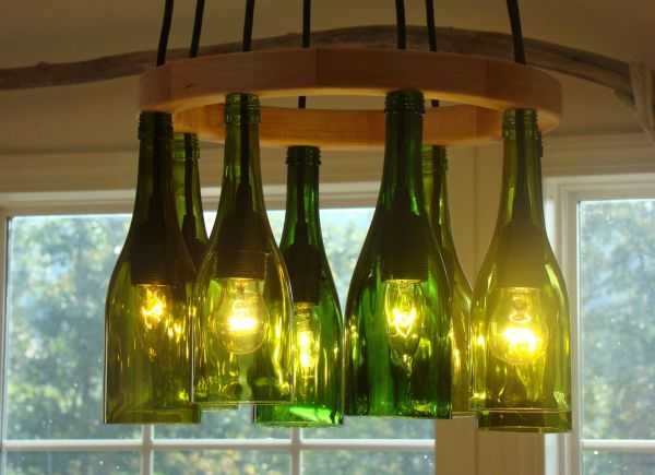 Очень интересно и необычно смотрятся люстры из разноцветных стеклянных бутылок из-под лимонада или пива. В общем направлений для полета фантазии великое множество.