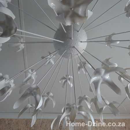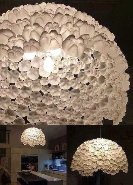 А как вам такая оригинальная люстра с использованием донышек от пластиковых бутылок? Конечно, своими руками здесь сделана только декоративная часть, но идея впечатляет. Не дешевый вариант, надо будет купить люстру с круглым пластиковым абажуром и постараться его не испортить, но искусство требует жертв.