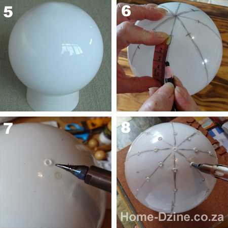 Наносите разметку на пластиковом шаре, также паяльником делаете отверстия и вставляете палочки с пластиковыми «лепестками». Надо быть очень аккуратными с паяльником, чуть передержите, дырка получится больше, чем надо, в этом случае можете обернуть конец штыря изолентой и зафиксировать клеем. В общем, наберитесь терпения.